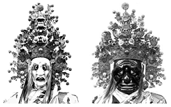 This two guys called 黑hēi 白bái 無wú 常cháng (Black and white impermanence) or 七qī 爺yé 八bā 爺yé (Seven and Eight Lord ), they are always put in the Cheng-Huang temple. They are two of traditional Gods in Chinese culture, their job is like police to arrest ghost ,they also have right like procurator in the ghost world.